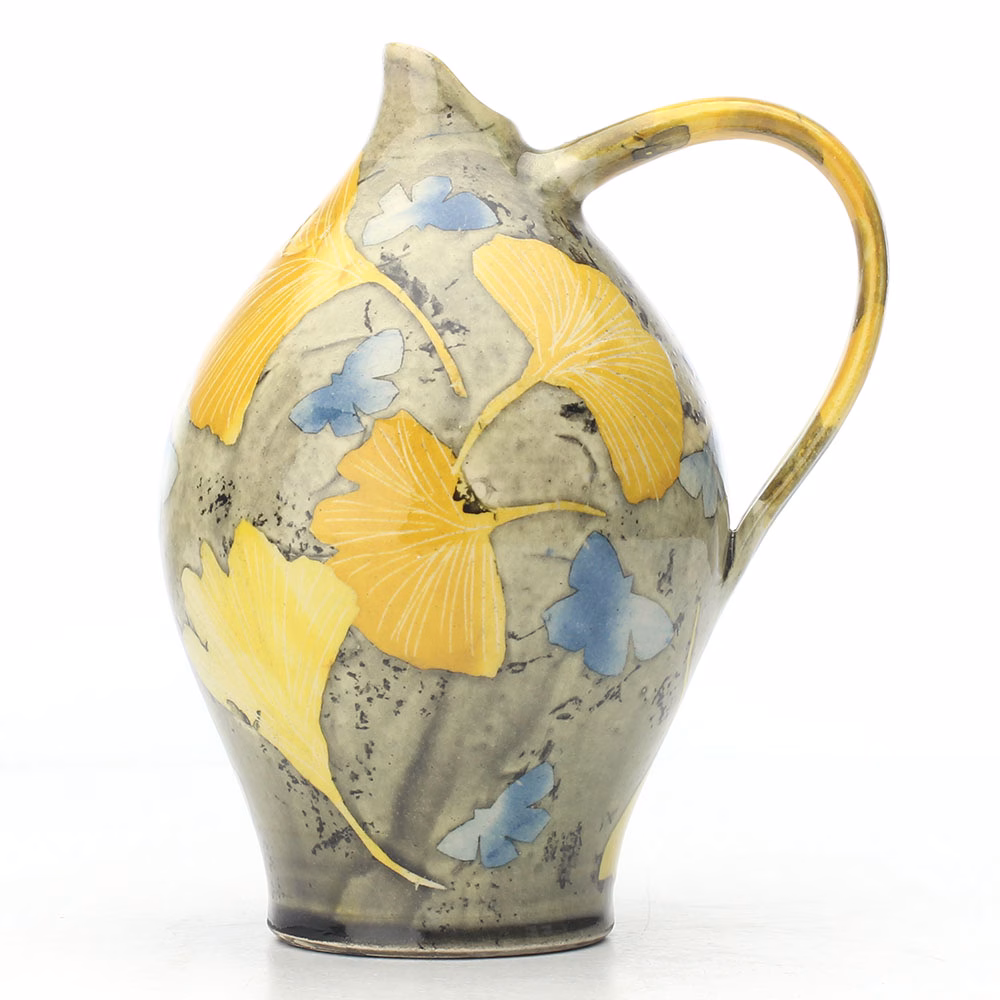 This thrown earthenware oil jar is handcrafted by ceramic artist Sophie MacCarthy and decorated with delicate ginkgo leaves and butterflies using coloured slips. Signed on the base and shown here with the artist, it is both a functional vessel and a collectible piece.