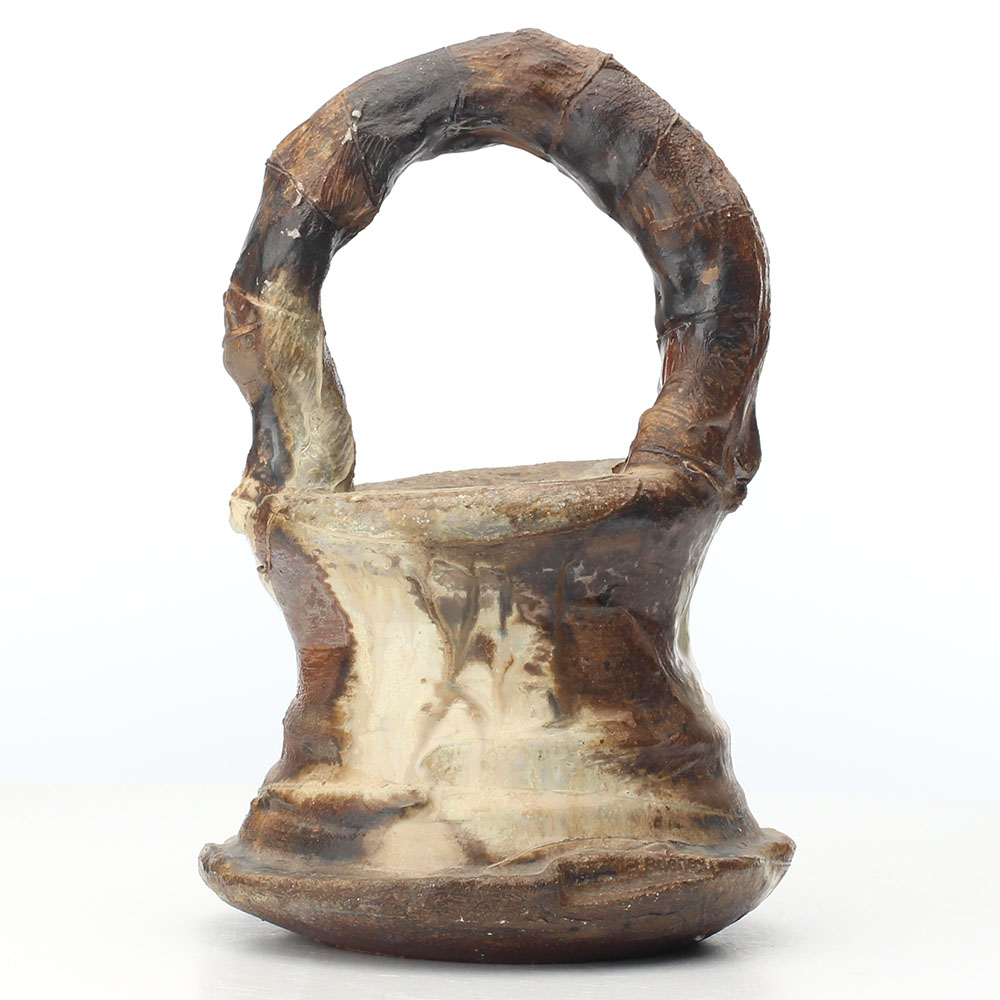 This is a large and heavy thrown footed bowl with shino glaze by Ben Brierley that has been anagama wood fired. Ben is pictured holding this pot that he has stamped ‘Benedict Brierley’ on the foot.