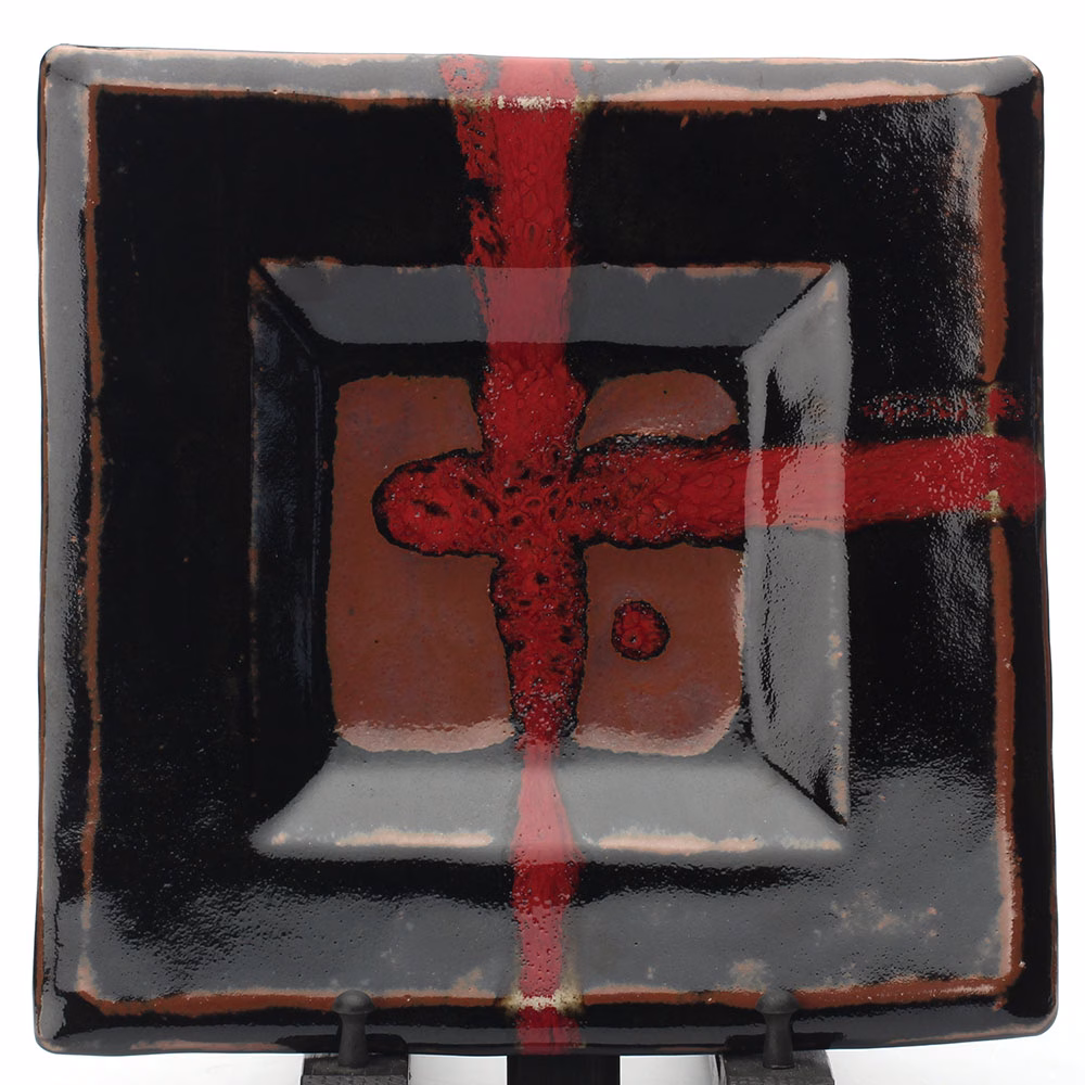 A substantial stoneware slab-built plate raised on feet by ceramic artist James Hake. Finished in rich tenmoku, kaki, and copper red glazes, this striking piece showcases depth, warmth, and subtle variation in tone. The plate is impressively weighty, as shown by the artist holding it, and is stamped on the base with his maker’s mark.